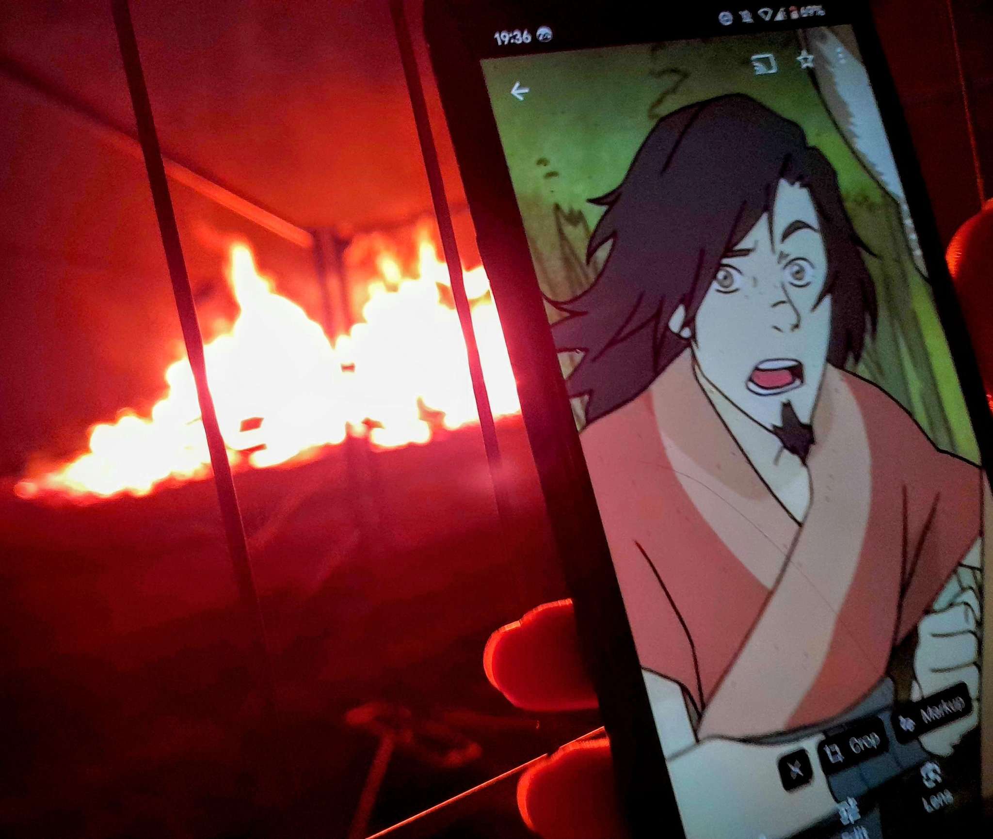 On the Wan side of things, it was of being on the lion turtle that he was from. It was outside the city and underneath the trees at night, right on the lion turtle's back. It was dark but kind of illuminated by the moonlight above through the canopy. If you looked into the distance, you could see this sort of outcrop of rock above which stuck out with a ledge at the end.