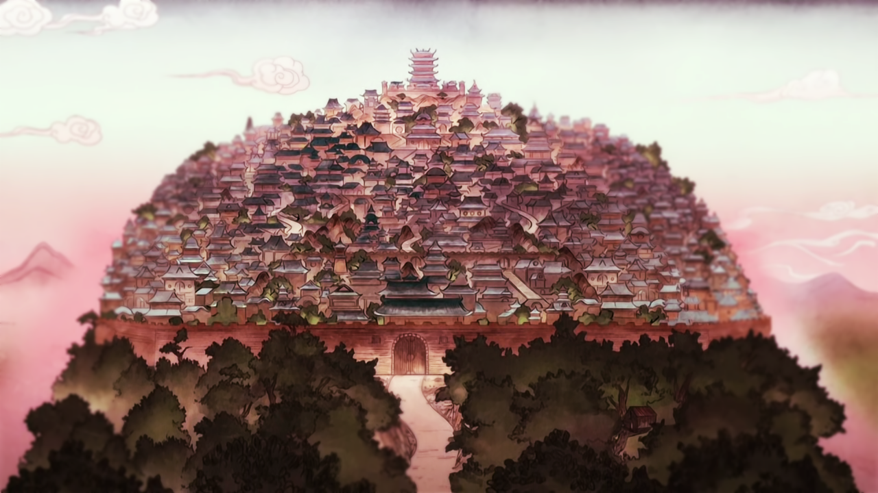 Cut to an overview shot of the entire city slowly panning down. A tree house is visible among the tree branches of the surrounding forest. Cut to a closer shot of the city's houses panning down to the forest and eventually the tree house as Wan enters it. Switch to a view from the inside out, revealing a young man sitting on the ground on the left, watching Wan climb through the door.